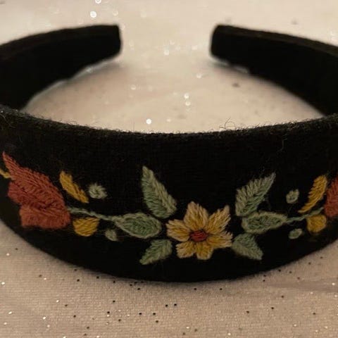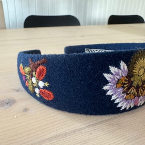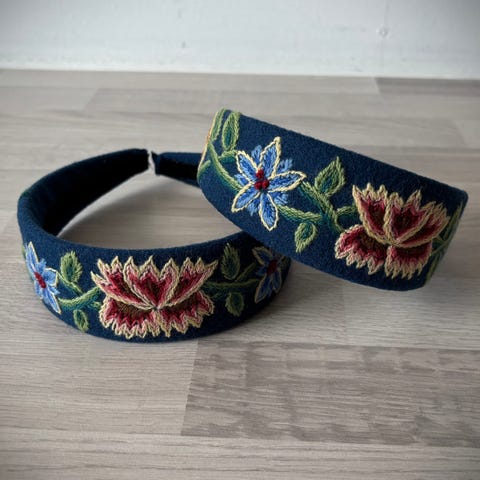 Håndbroderte hårbøyler i originalt løkenstoff. Hårbøylene er ca. 4 cm. på det bredeste. Har blå og svart.