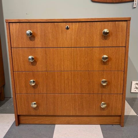 Kommode i teak som har tre skuffer. Den ene skuffen har lås og nøkkelen følger med. Ingen bruksmerker.