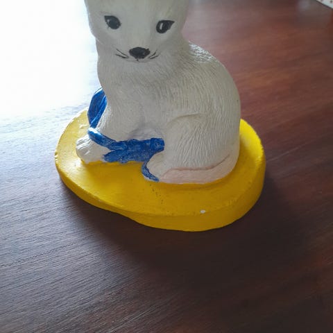 Figuren har gullfarget sløyfe og detaljer på snute og munn, høyden er ca. 19 cm, hul under og står stødig på fire poter.
