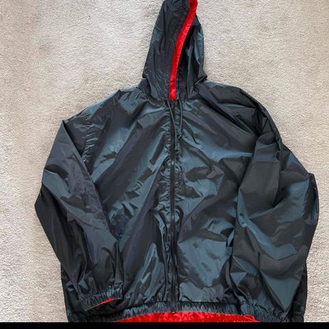 Gucci Jersey jakke i størrelse L. Jakken er svart med mønster og har detaljer i flere farger. Laget av jersey-materiale, designet for menn.