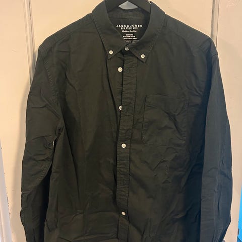 skjorte i størrelse L. Fargen er svart, og materialet er polyester. Skjorten har knapper foran og mansjetter med knapper.