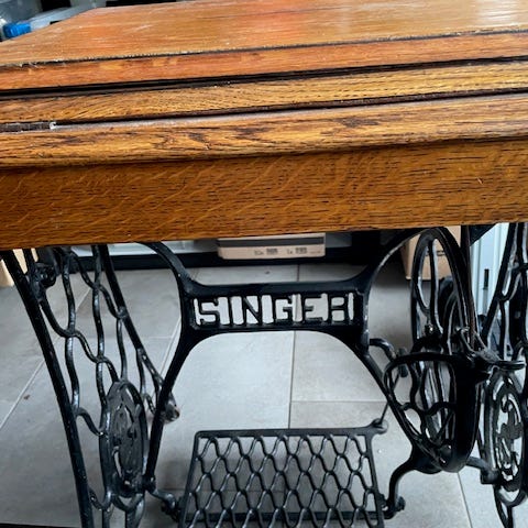 Singer symaskin med treskap og fotpedal. Treskapet har skuff for oppbevaring og lokk som dekker symaskinen. Maskinen er mekanisk og betjenes med fotpedal i støpejern. Passer til manuell bruk for søm og reparasjon av tekstiler.