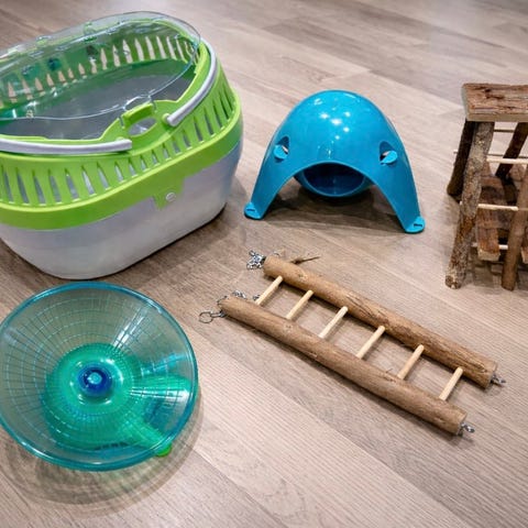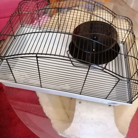 Bur med metallgitter og plastbunn, egnet for små kjæledyr som hamstere eller mus. Inkluderer vannflaske, matfat, løpehjul + div. Str ca 30x40. Må hentes.