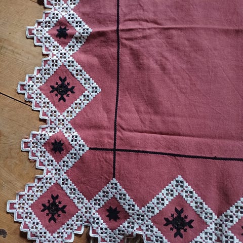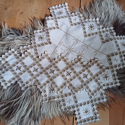 Nydelig brodert duk ( Hardanger) og 8 små servietter med broderi i lin/bomull blanding. Selges samlet til 300