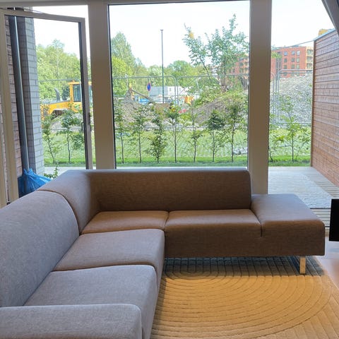 Disse møblene er veldig gode å sitte i og med den smarte pallen/puffen har man både fothviler, stuebord og oppbevaring i ett og samme møbel.