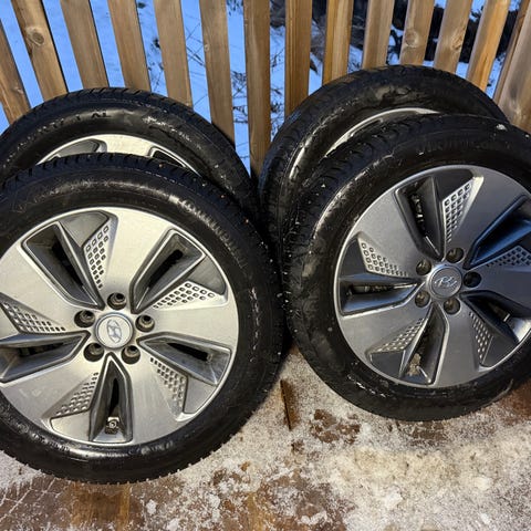 Jeg selger et komplett sett med vinterhjul til Hyundai Kona, originale felger utstyrt med trykksensorer og Kumho 215/55r17 vinterdekk, felgene har riper men er ikke skjeve eller sveisede, nylig balansert og lagret på hjulhotell.