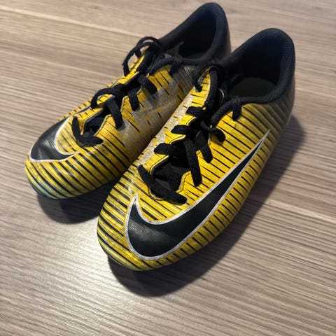 Nike Mercurial fotballsko med oransje og blå farger. Skoene har knotter på undersiden for bedre grep på gressunderlag. Designet for bruk på fotballbanen.