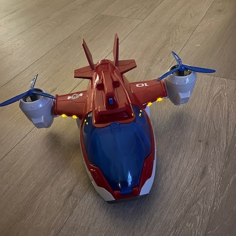 Paw Patrol lekefly med en medfølgende figur. Flyet har lys og lyd på.
