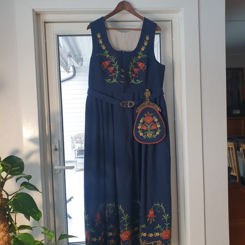 Jeg er c 159 høy og bunaden streifer akuratt bakken. Er syd inn til Small men er ekstra stoff på innsiden så man kan legge ut. Bunad skjorte Str S føler med. Medfølger også sølv. Er minimalt brukt.