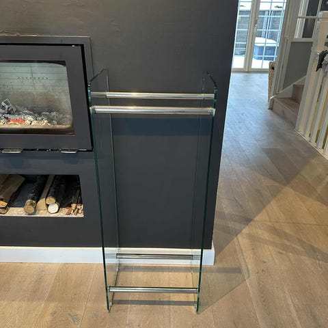 Solid Vedstativ med granittbase og tykt glass i sidene. Veldig stødig.
