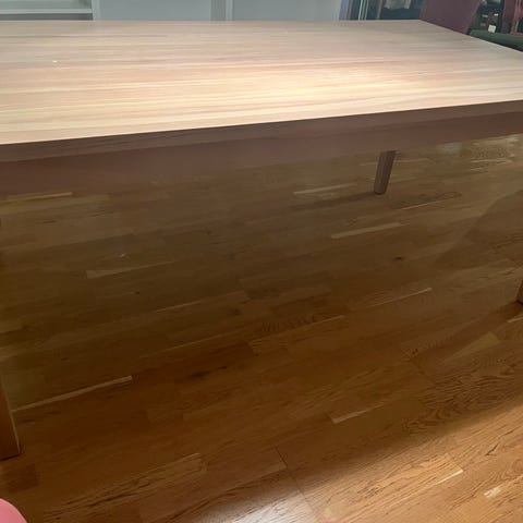 Selger også 2 stk forlengningsplater på 50 cm som enkelt festes på hver kortside av bordet. Total bordlengde med forlengningsplater blir da 280 cm (180+50+50) Du sitter fint 10 pers rundt bordet med begge ileggsplater. Ileggsplatene er brukt svært få ganger og fremstår som nye. Her får du altså et bord i heltre på nesten 3 meter som er så godt som nytt.