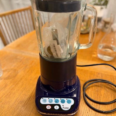 Godt brukt blender. Farge rød. Selve kolben er skiftet ut og har grått håndtak.
