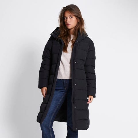 Lang, figursydd boblejakke. Sidelommer med glidelås. Hette med snøring. Glidelås og vindstolpe med trykk-knapper. Jakken er impregnertmed Bionic finish® eco, vilket gjør atden er vannmotstanden.