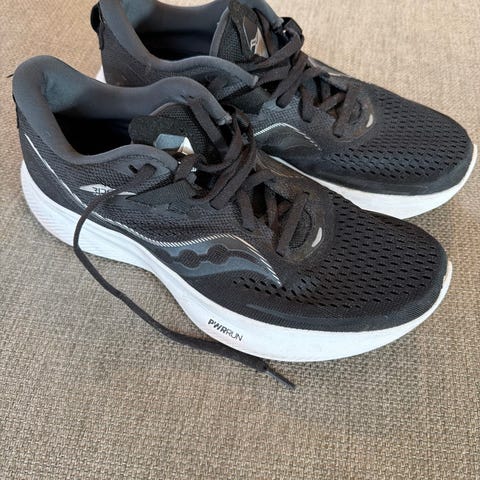 Timberland løpesko i størrelse 41. Skoene har svart og hvit fargekombinasjon og er designet for løping.