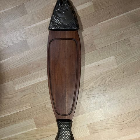 Stilig fat med bilde/konturer av fisk i bunnen. Fatet er håndlaget av Muurla i Finland. Mål: lengde 49 cm, bredde 22 cm. Fatet er ganske massivt. Fint også som pyntefat.