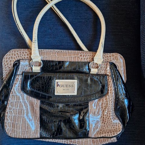Dame veske laget i stoffmateriale. Vesken har et mønstret design med blomsterdetaljer og to håndtak. Innvendig har vesken flere lommer for oppbevaring.