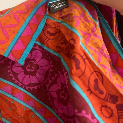 Gudrun Sjödén Genser i størrelse L for kvinner. Genseren er flerfarget og laget av bomull. Den har et mønster med ulike farger og teksturer.