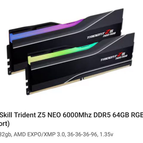 Hei! Sjekker interessen for mitt G.Skill Trident Z5 Royal Neo RGB DDR5-6000MHz - 64GB (2x32GB) - CL26 - Dual Channel (2 pcs) - AMD EXPO - Gold med RGB RAM kit.