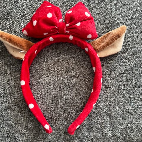 Disney Minnie Mouse/ mus hårbøyle for dame med svarte ører og rød sløyfe med hvite prikker. Laget av mykt materiale, egnet som tilbehør til kostymer eller hverdagsbruk.