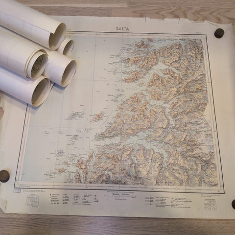 Jeg har flere annonser ute av disse topografiske kartene fra US Army Map Service (AMS M515-serien) – eksklusive originaltrykk fra 1950-tallet i målestokk 1:250 000. Kartene er typisk basert på kartografiske målinger fra 1930- og 1940-tallet, av aktører som nasjonale oppmåling instutisjoner (f.ex NGO eller ligende), tyske/allierte styrker og etterretningstjenester. Produsert for amerikanske styrker og NATO-allierte. Fra tilnærmet perfekte kanter til litt slitasje/patina som små rifter, bølger og svak gulning. Fokus på flyinfrastruktur som reserveflyplass (auxiliary airfields) og sjøflyhavner (seaplane anchorages), med friske grønne toner og transverse Mercator-projeksjon. Autentisk patina med tydelig preg av kald krig-historie.