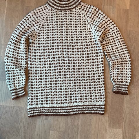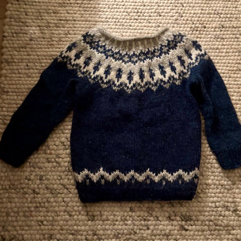Nydelig genser i det vannavvisende og slitesterke islandske garnet "lopi*. Har tatt bilder med alle mål (zoom inn så ser du hva det står på målebåndet). Passer normal fasong 6-8 år. Kanskje aller best fra 6-7, høydemessig. Er oppbevart innendørs i røykfritt og dyrefritt hjem. Ikke vasket.
