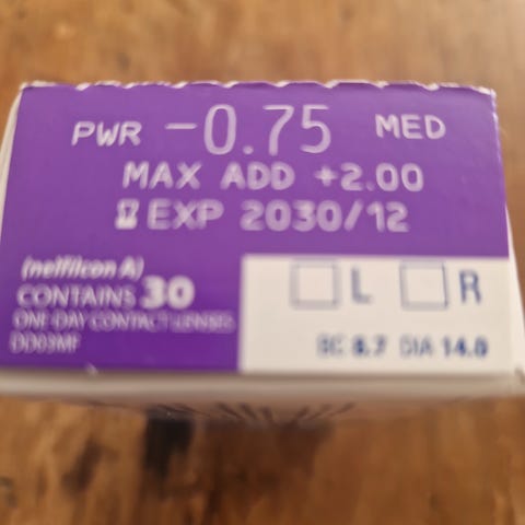 Holdbarhet til 31.07.2027 for alle linsene utenom den ene som holder til 31.03.2026.