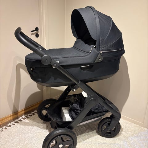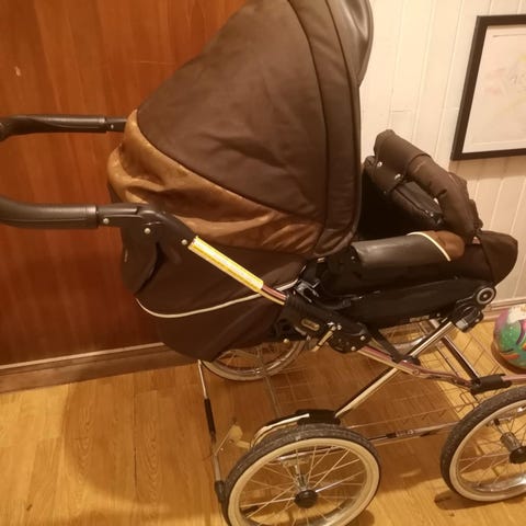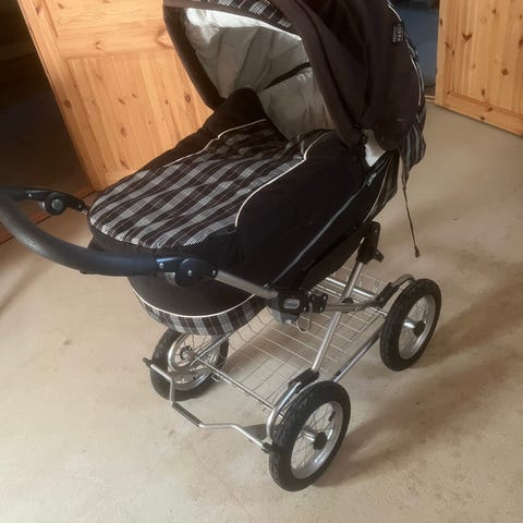 Emmaljunga barnevogn med svart tekstil og brun håndtak