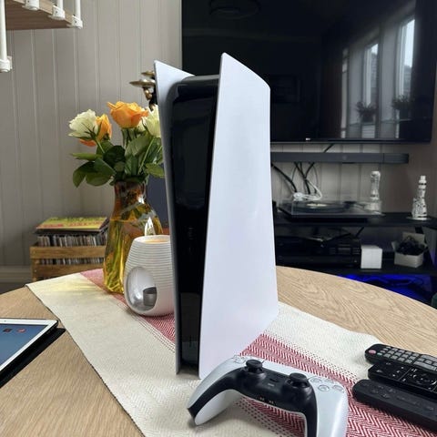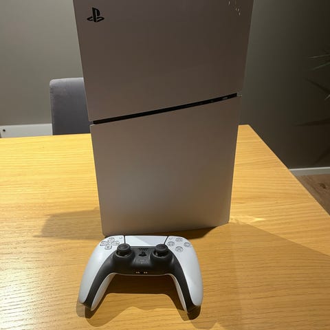 Sony PlayStation 5 spillkonsoll med medfølgende kontroller. Konsollen har et hvitt og svart design og støtter 8K-oppløsning.