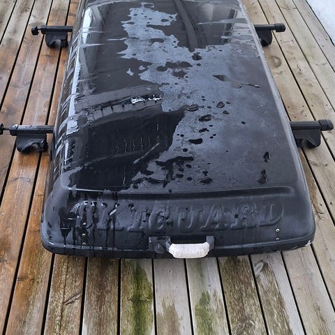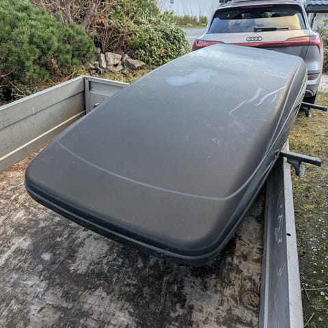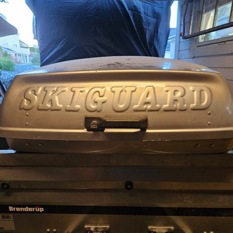 SkiGuard 860 takboks i sølvfarge. Takbøyler følger med. Takboksen er designet for å transportere ski og annet utstyr på biltaket. Den har en romslig kapasitet og er laget av slitesterkt materiale. Har noen riper på topplokket.