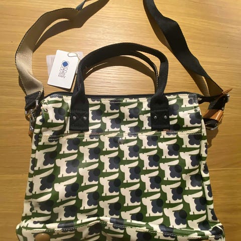 Denne vakre vesken fra Orla Kiely måler 49 x 49 cm bred/lang og 12 cm dyp. Svært lite brukt og fremstår i tilnærmet nyskikk. Kjøpt på Heal’s i London.
