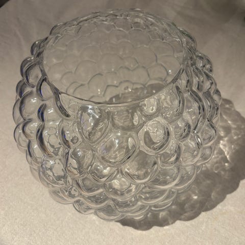 Stor og kompakt lysestake i klart glass med stilig hullmønster. Passer til små og store telys. Ubrukt. Sender mot porto.