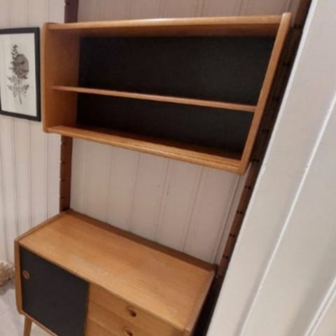Ganske hissig veggreol som trolig er produsert i Norge på 50-tallet. Ukjent designeren og produsent. Har bruktmerker og skavanker, men kan brukes som den er eller settes i bedre stand. Skuffer og dører fungerer fint. Det følger ingen nøkler med.