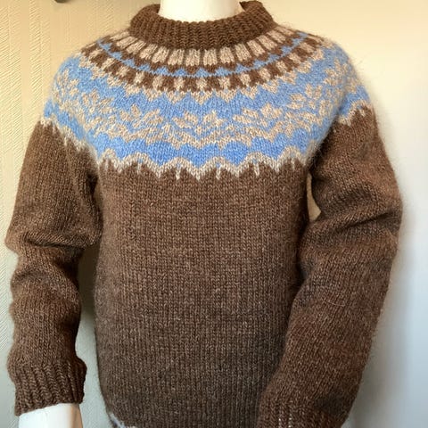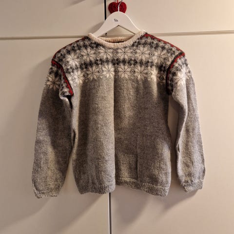 Hjemmestrikket julegenser i Lettlopi islandsk ullgarn. Brukt 3 ganger. Selges fordi den ble for stor. Bredde 68 cm, under arm 45 cm, lengde 75 cm. Hentes eller sendes med Posten.