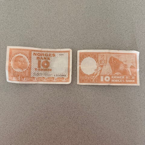 Norges Bank 10 Kroner sedler med serie- og nummerdetaljer synlige. Sedlene har historisk design med portrett og dekorative elementer på forsiden og baksiden. De er i brukt tilstand.