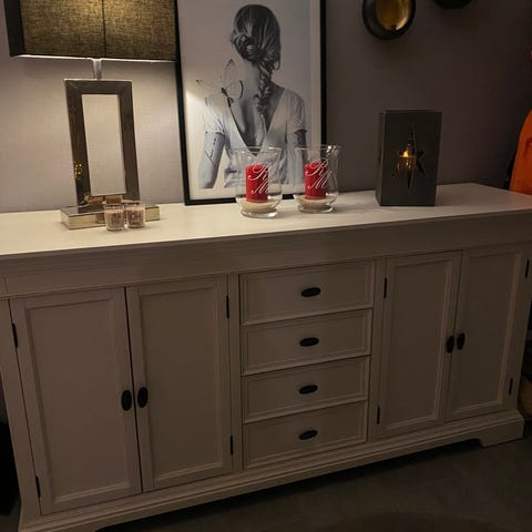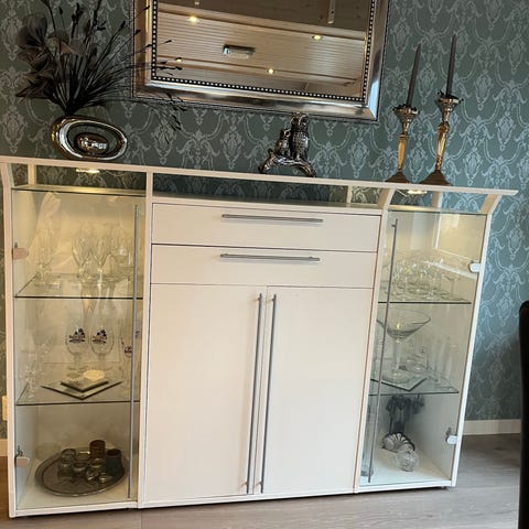 Fin skjenk i 4 deler med 2 glass dører og innvendig skuff og lys