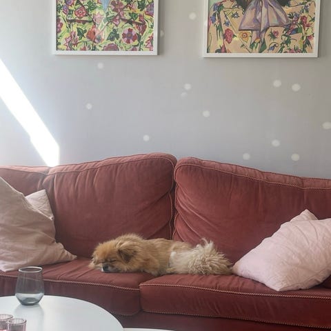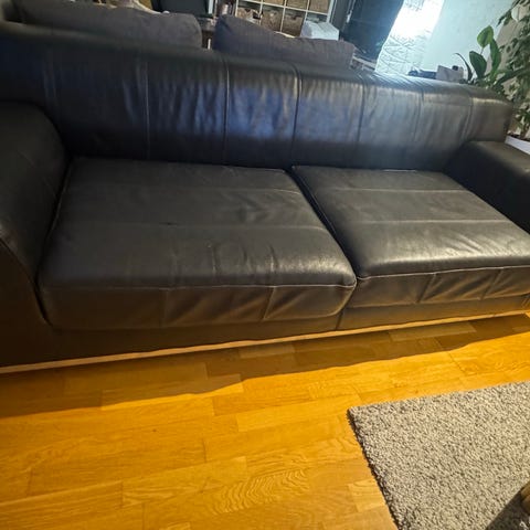 Blå sofa, kan sitte tre personer, fra Bohus eller Skeidar om ikke jeg husker feil. Røykfritt, men har vært hund i den. Ikke flekker eller rifter. Fin å sitte i, selger pga bytte til sovesofa.