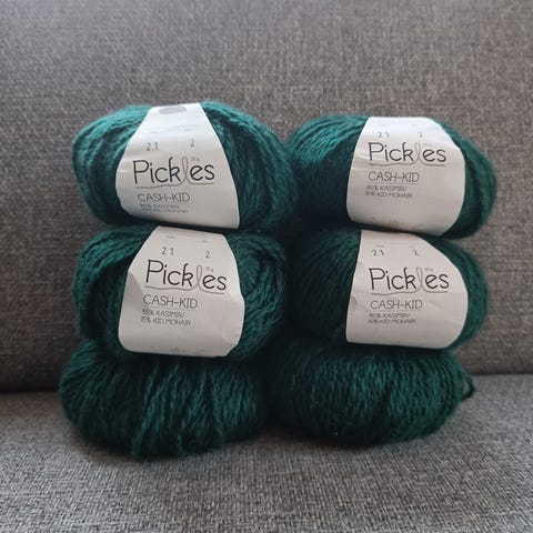 7 nøster/800 m Pickles angora nougatbrun (70% angora 20% nylon/10% ull). Mulig jeg har en rest i annen lot.