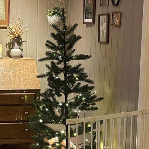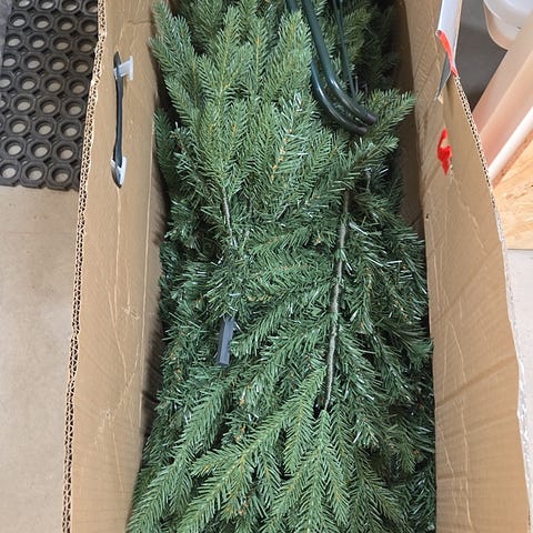 Pent juletre som blir veldig tett når du tar ut grenene på det ordentlig. Den har stått sånn at det har fått litt fukt på seg, og derfor har gjengene rustet litt. Dette vises ikke når treet er pyntet, men det selges derfor billig.