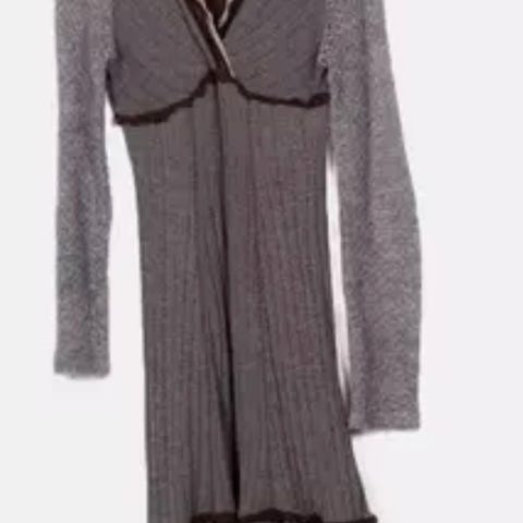 Flott kjole som ble kjøpt fra Tulip & Tatamo for noen år siden. Veldig behagelig materiale i viskose og spandex. Bunnfargen er sort, det er lagt inn gulltråder på armene og smale brunorange striper på skjørtet og mansjettene ved armene. Kjolen har to lommer på sidene.
