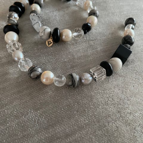 Kjeden kombinerer ulike former og fasetterte steiner, og har en variert tekstur og fargepalett som inkluderer klare, svarte og perlehvite elementer.