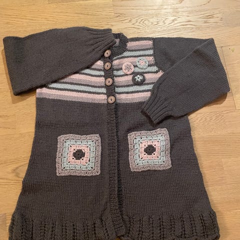 Strikket med heklede detaljer påsydd - farger brun, rosa og lys grønn.