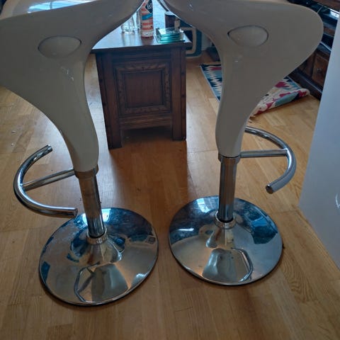 Selger to hvite barstoler. Stolene er svært praktiske da de kan svinges 360 grader og høyden kan enkelt justeres etter behov.