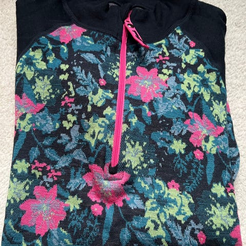 Daniel Franck ullgenser for dame i størrelse 36. Plagget har et mønster med blomster i lilla og rosa nyanser. Passer til ulike sportsaktiviteter.