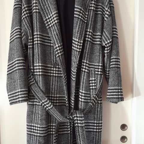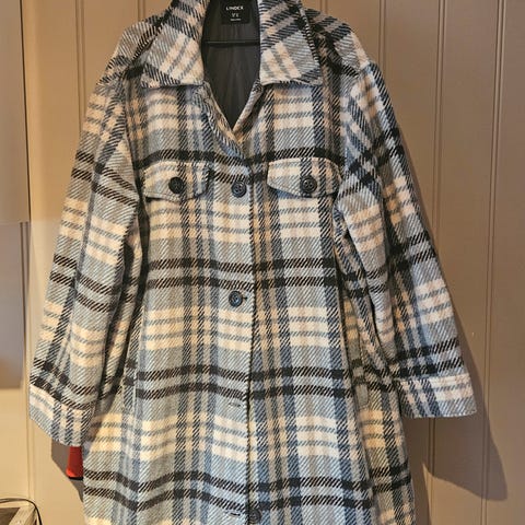 Lindex kåpe i ull, svart farge, størrelse XL. Laget av ullmateriale, designet for kvinner. Kåpen har en klassisk stil med knapper og lommer, egnet for utendørs bruk. Lengden er 83 cm fra sømmen på kragen og ned.