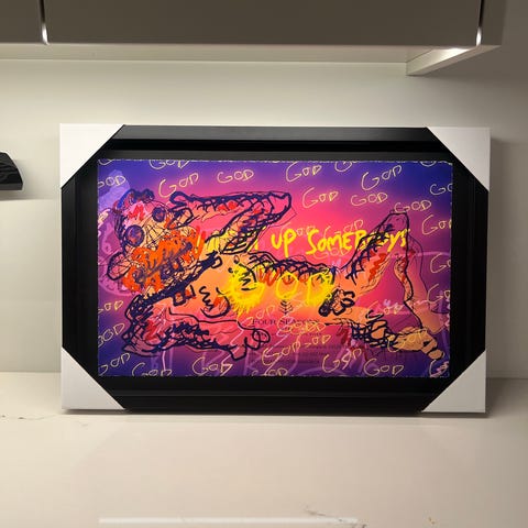Bildet er 90x140 og innrammet med kunstglass.