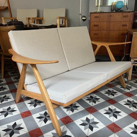 3-seter sofa tegnet av Erik Wørts i eik. Nye puter i Hallingdal fra GU