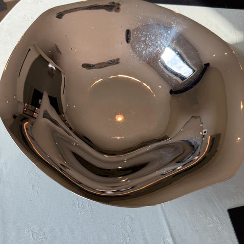Georg Jensen dekorasjonsornament i metall med en moderne, buet form. Brukes som dekorasjon i hjemmet eller på kontoret.