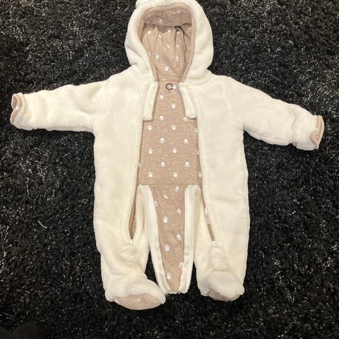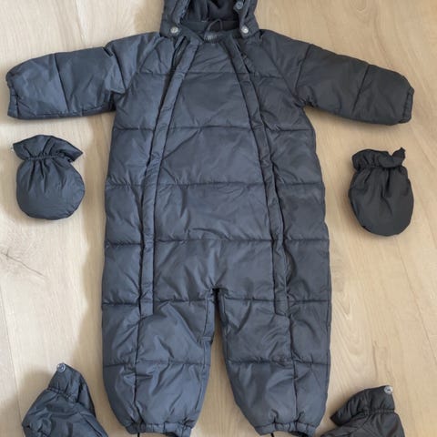 H&M vinterdress i størrelse 50, designet for barn. Dressen er grå og laget av polyester. Den inkluderer matchende votter og sko. Passer for både gutter og jenter.