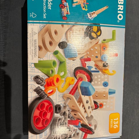 BRIO og en andre merke barnas lekesett i tre med ulike deler for konstruksjon og lek. Settet inkluderer verktøy og komponenter i tre og plast, egnet for barn.