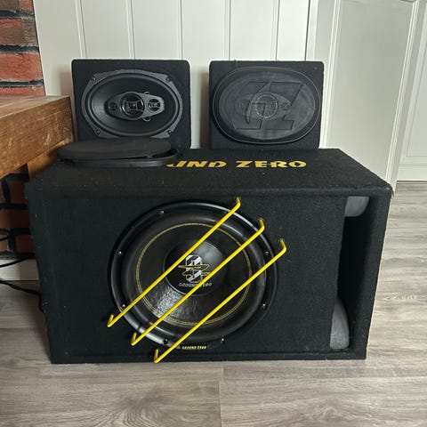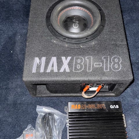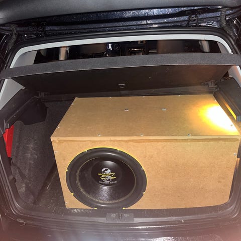 Basskassa er bygget selv, der det er brukt 22mm mdf plater og topp plata er 44 mm det er også 2x2 i porten for avstiving når den flexet veldig mye samt 2x4 fra topp til Bonn, basskasse er tunet til rundt 27hz og kan gå veldig mye lavere,. Kassa er lakket 3 strøk med raptor gard, kassa har bruksmerker, har en liten fuktskade på toppen men spiller ingen rolle den er fri for fukt og funker som den skal.